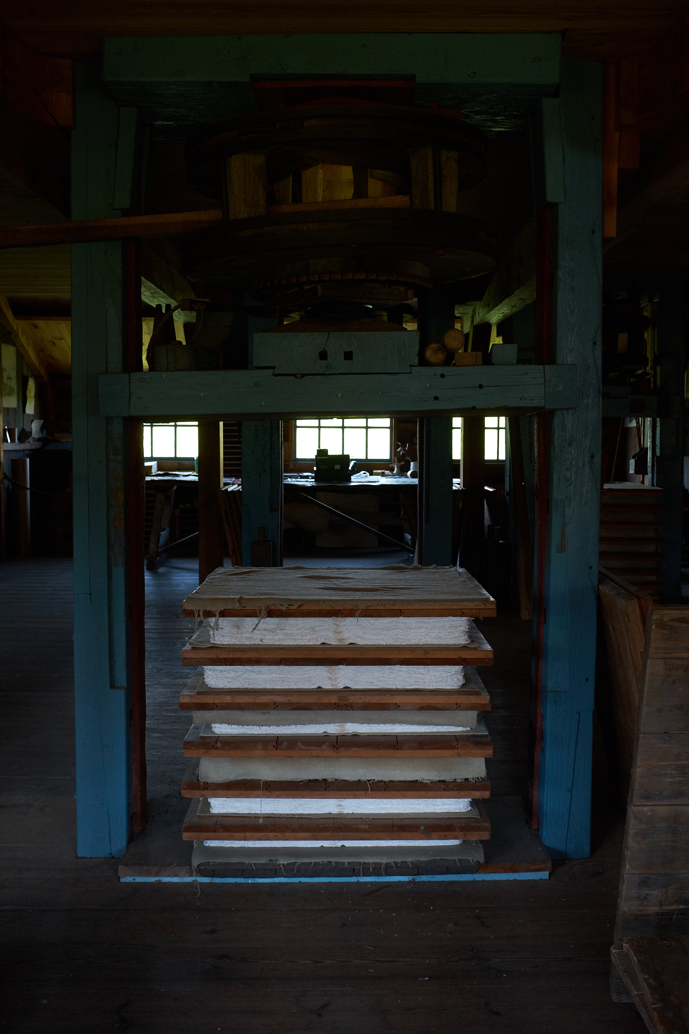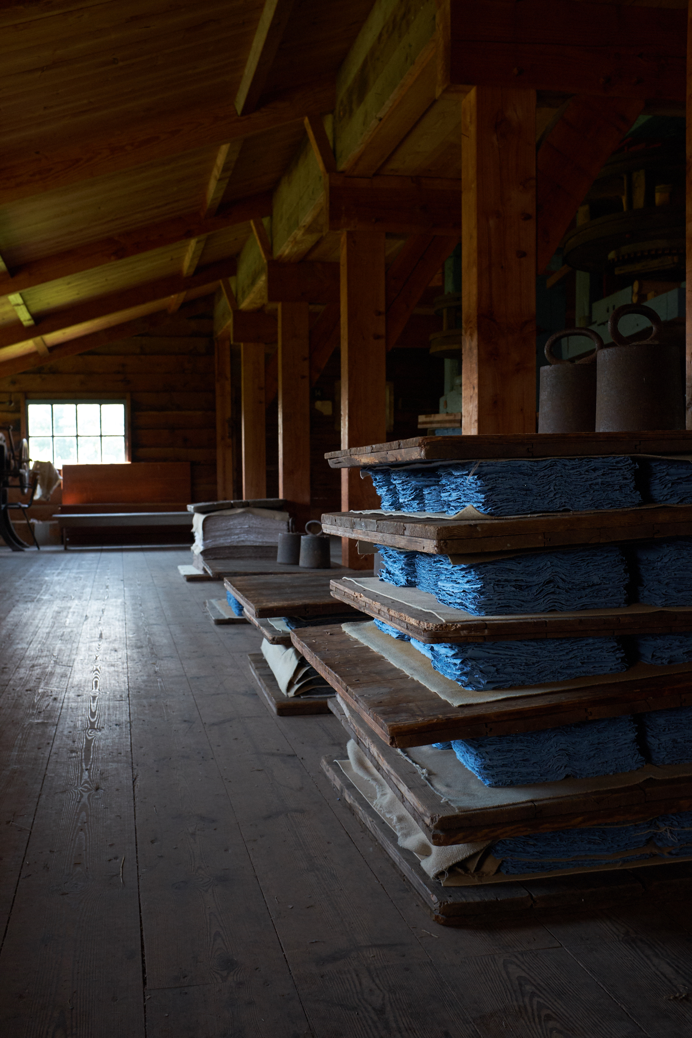 the miller was very accomodating (we were the only visitors, i think, that day) and set up a video at the end of the self-guided tour that is in english and very well made. there was no papermaking going on while we were there (the miller was repairing some equipment), but as you can see below, plenty of paper was on display.