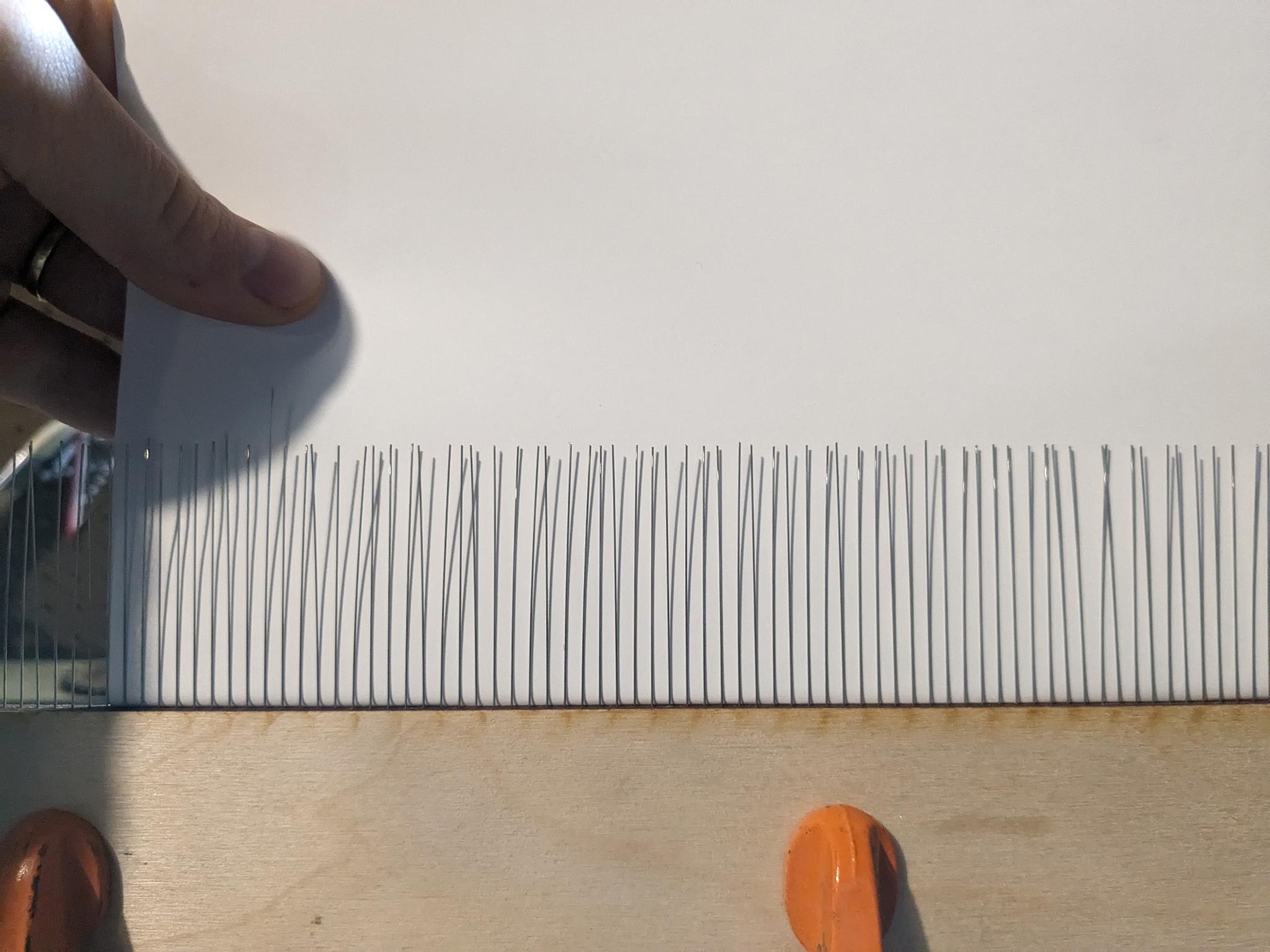 - rip the folded up piece of paper off the paper holding the pins in place. now, remove the paper off the pins: huzzah, you have a ⅛" comb! (even if a bit flimsy).