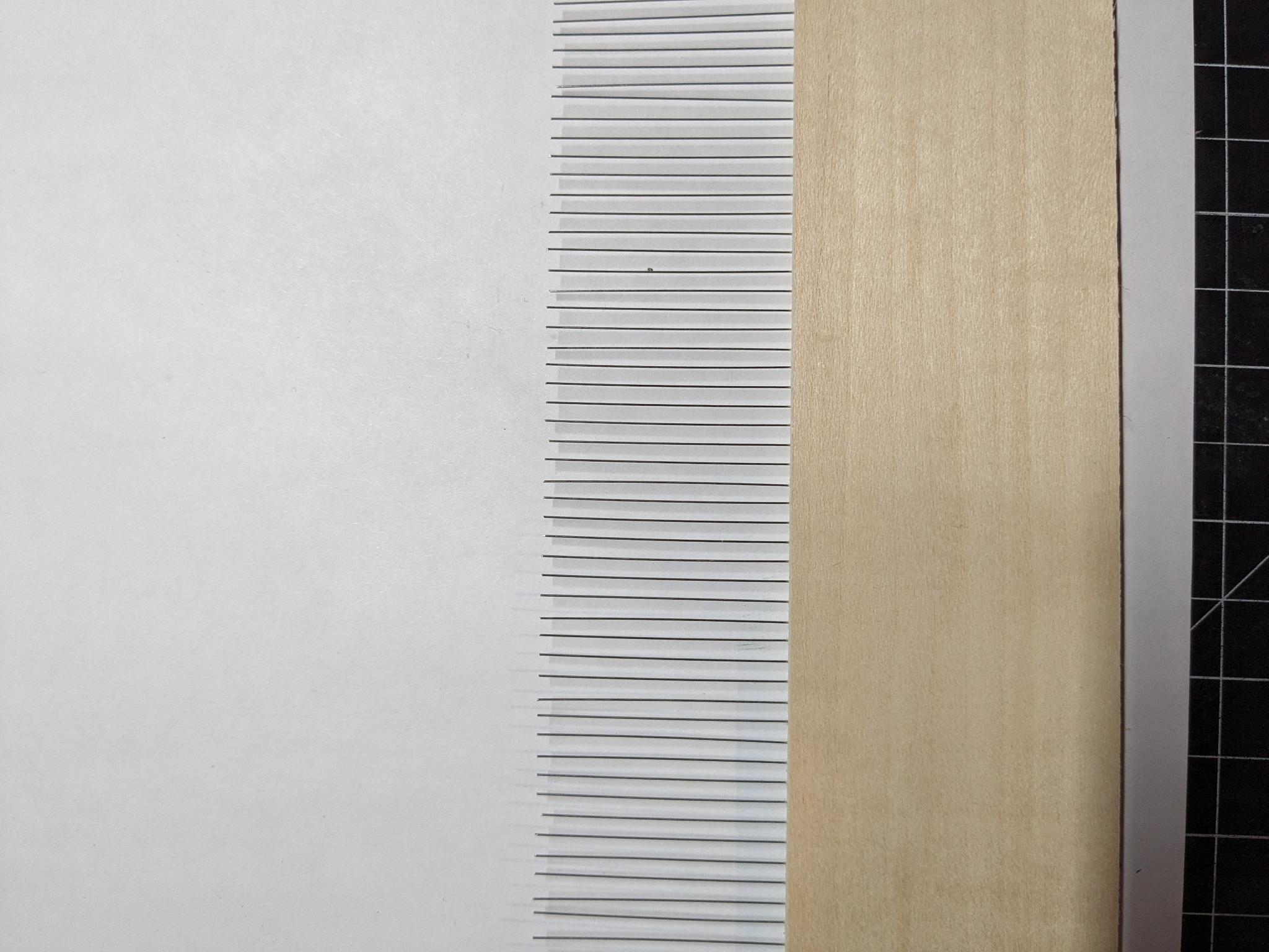 while ideally i'd like an option that is a single set of tines, the most useful comb i've created that achieves a 1/16" pattern is with two sets of 1/8" tines. Dan St. John of the Chena River Marblers has a method for making single-row high-dent combs (i've used up to his 10-dent comb), using .015 diameter wire, which i've adapted for a sparsely equipped studio.