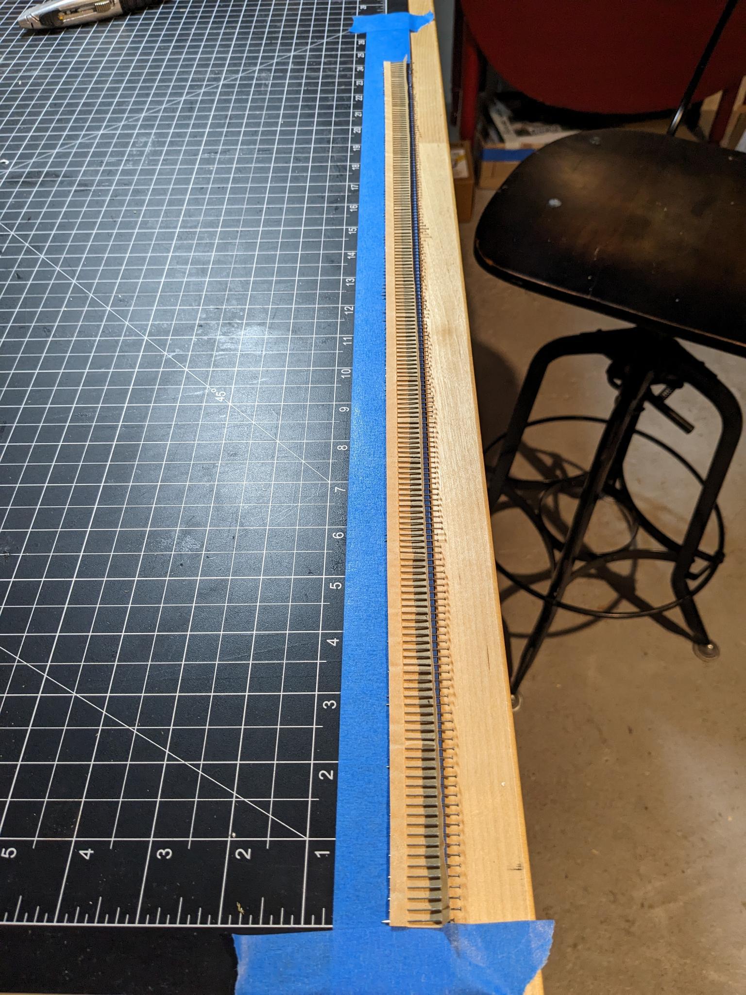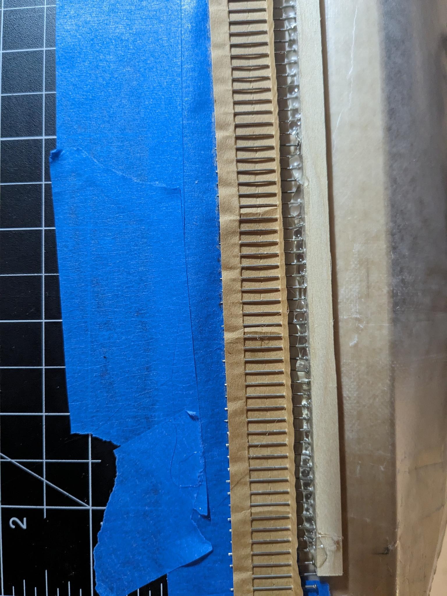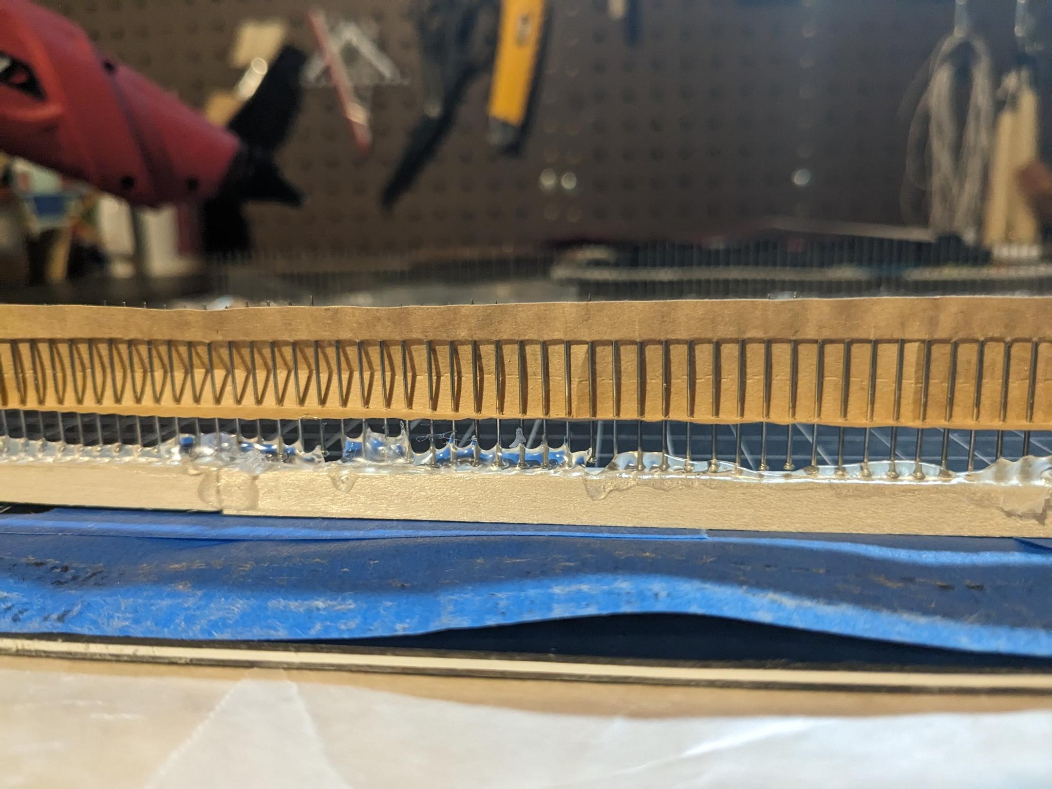 - lay another bead of glue and repeat for the other length of brass pins, making sure to align the pins so they bifurcate the first set of pins laid. i used painters tape to keep the pins from leaning over while drying.