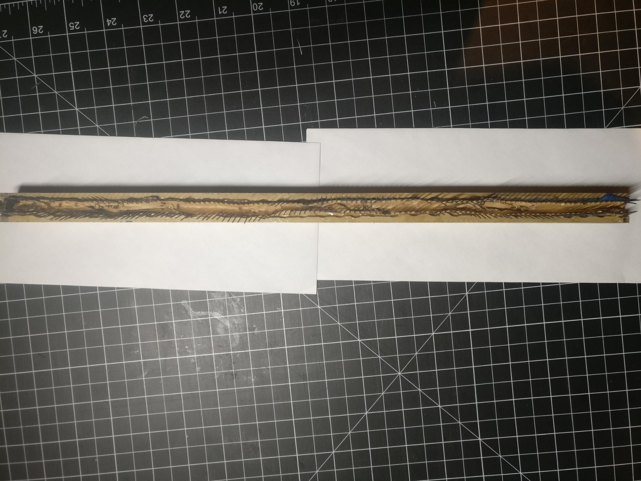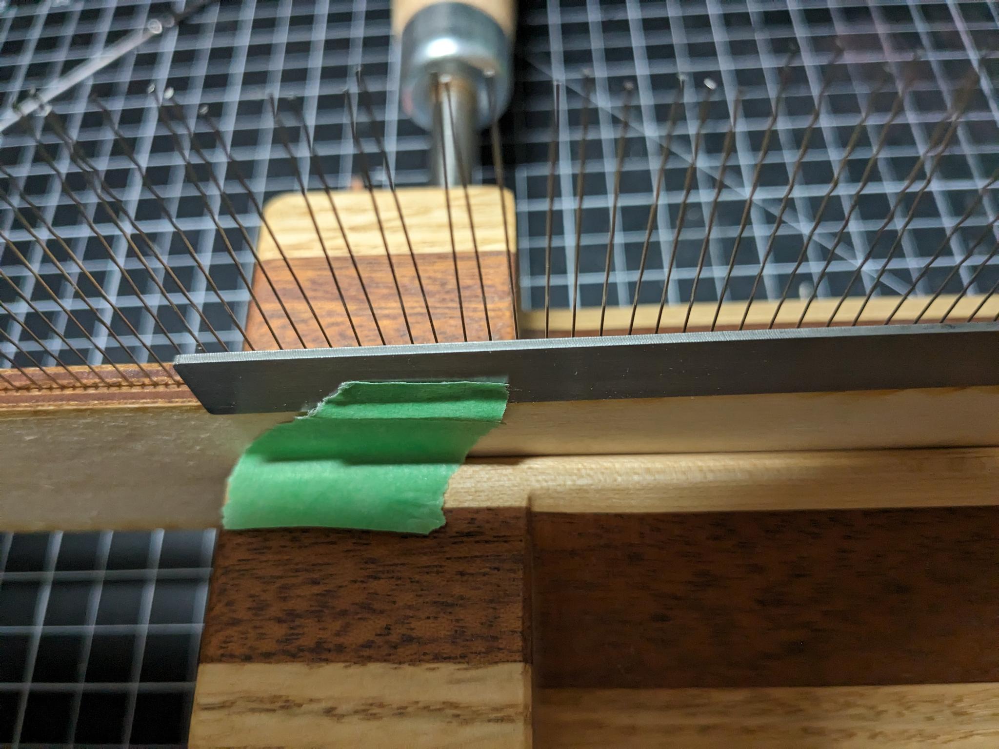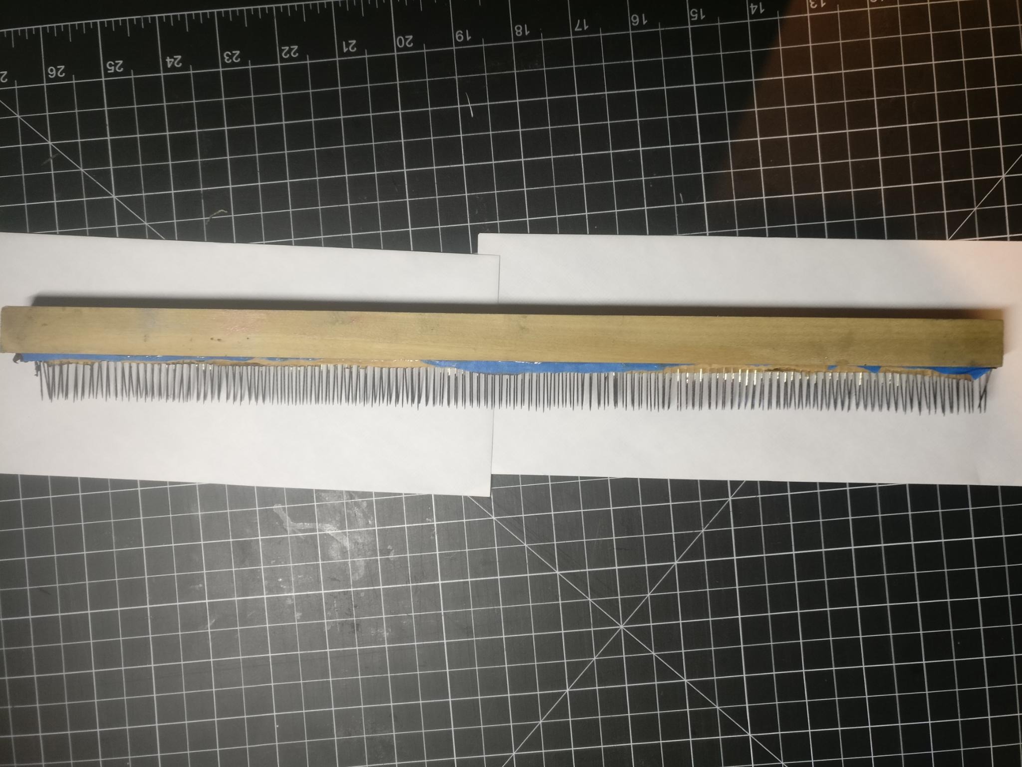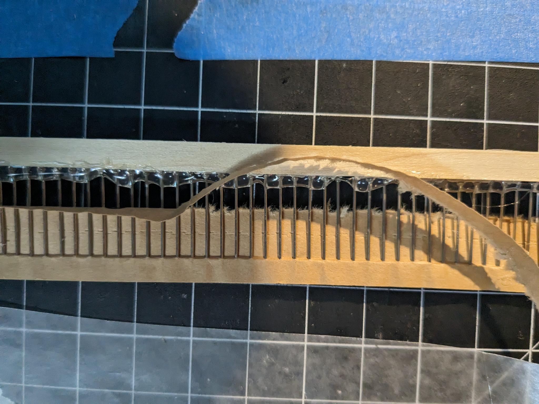 - lay another bead of glue and repeat for the other length of brass pins, making sure to align the pins so they bifurcate the first set of pins laid. i used painters tape to keep the pins from leaning over while drying.