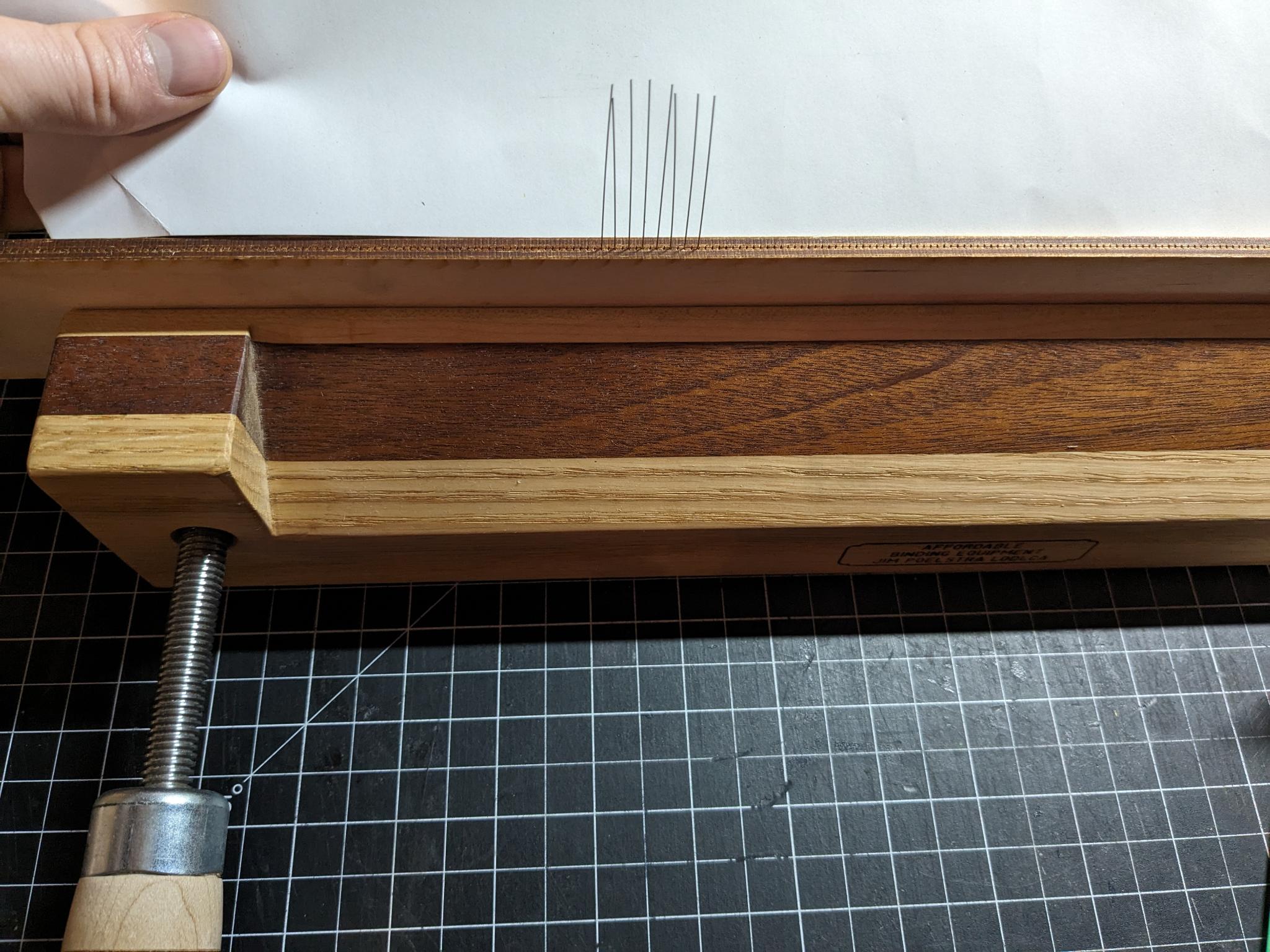 - i recommend adding a half inch support above the jig to add length to the final comb's tines. by default, this method i'm using will result in only 1" long tines in the final product, since that's how long the jig's wire depth is. i've tried other methods to get different lengths, but they are quite unwieldy, require a lot of clamps, and have some risky movements. an additionaly half inch is about where i've found the sweet spot to be in making sure the tines are straight.