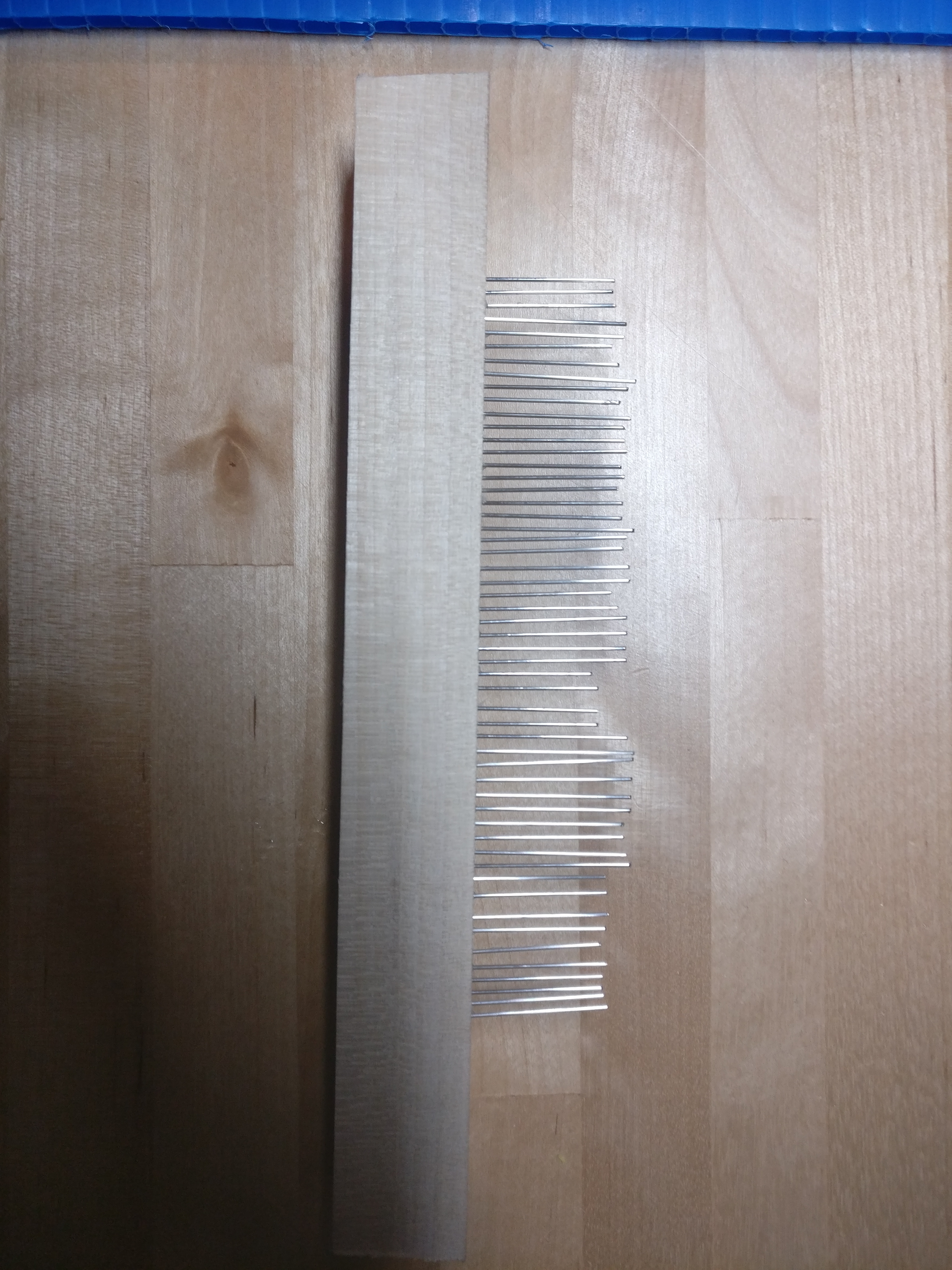 that is my first attempt: a 5" wide comb, with 1/16" spaced tines. the tines are 70-gauge stainless steel wire. holes were hand-drilled with a needle-nosed handdrill – the chuck slipped occasionally, hence why the tines are of uneven length.
